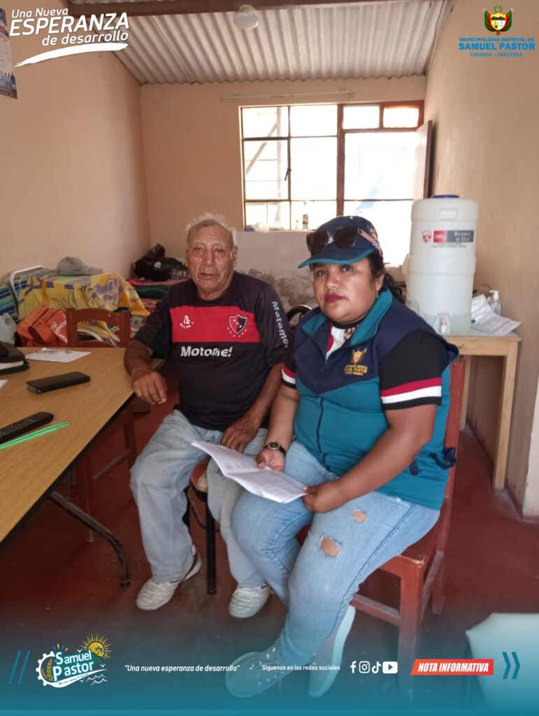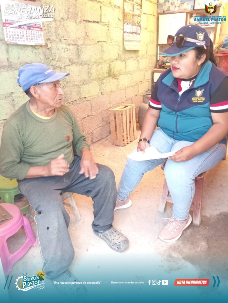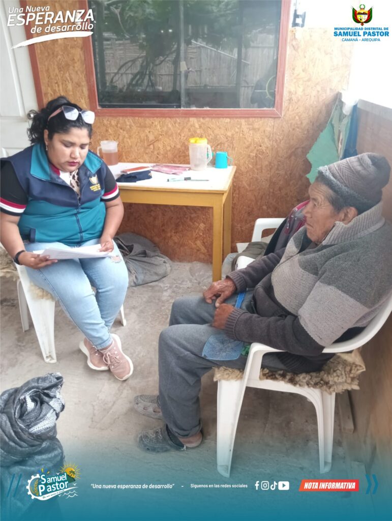 La Municipalidad Distrital de Samuel Pastor, a través de la Gerencia de Desarrollo Social, en coordinación con la representante del Programa Pensión 65 de la Provincia de Camaná, llevó a cabo una visita a los adultos mayores beneficiarios y a aquellos potenciales beneficiarios del programa, con el objetivo de verificar el estado de los usuarios del programa Pensión 65,