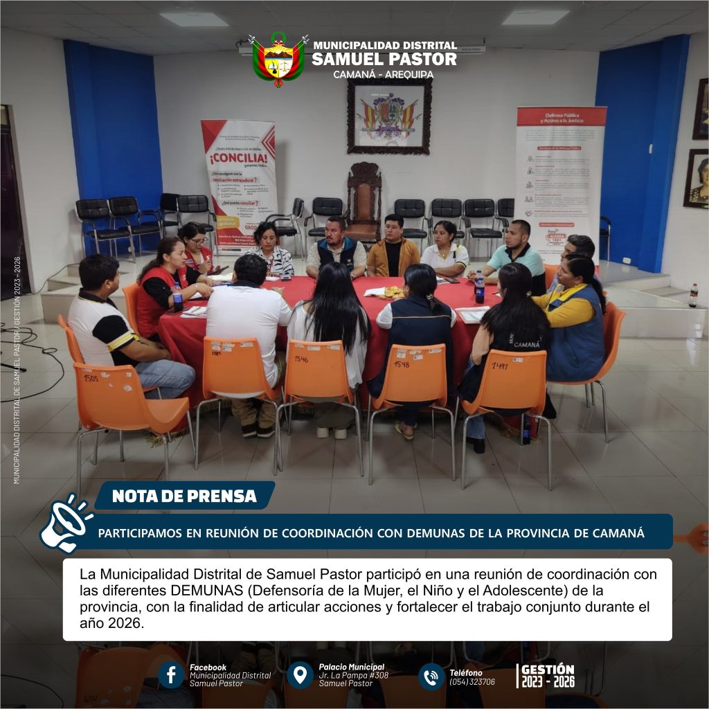 La Municipalidad Distrital de Samuel Pastor participó en una reunión de coordinación con las diferentes DEMUNAS (Defensoría de la Mujer, el Niño y el Adolescente) de la provincia, con la finalidad de articular acciones y fortalecer el trabajo conjunto durante el año 2026.