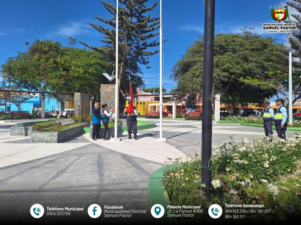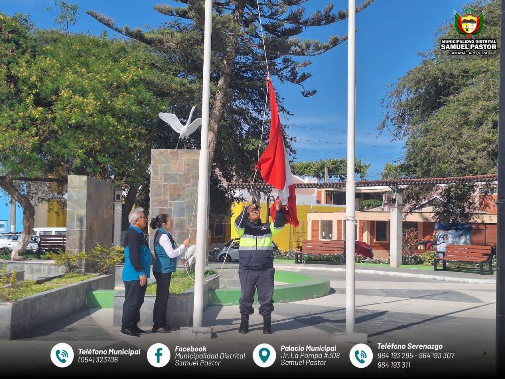 Con profundo fervor cívico, la Municipalidad Distrital de Samuel Pastor, junto a funcionarios municipales, quienes encabezarón la ceremonia de izamiento de la Bandera Nacional y la entonación solemne de nuestro Himno Nacional.
