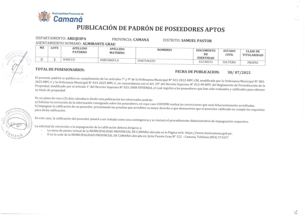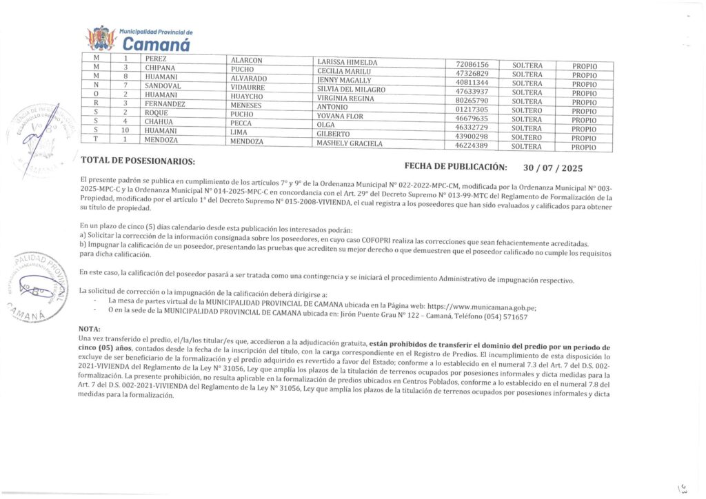 El presente padrón se publica en cumplimiento del Art. 29 del Decreto Supremo N° 013-99-MTC del Reglamento de Formalización de la Propiedad, modificado por el articulo 1° del Decreto Supremo N° 015-2008-VIVIENDA, el cual registra a los poseedores que han sido evaluados y calificados para obtener su título de propiedad.